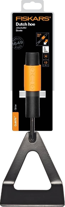 - Contenido: 1x Fiskars Azada ergonómica QuikFit, Cabezal de herramienta, Dimensiones: 2,8 x 29,5 x 12,5 cm, Peso: 241 g, Material: Acero al boro/Plástico reforzado con fibra de vidrio, Color: Negro/Naranja, 1000676.